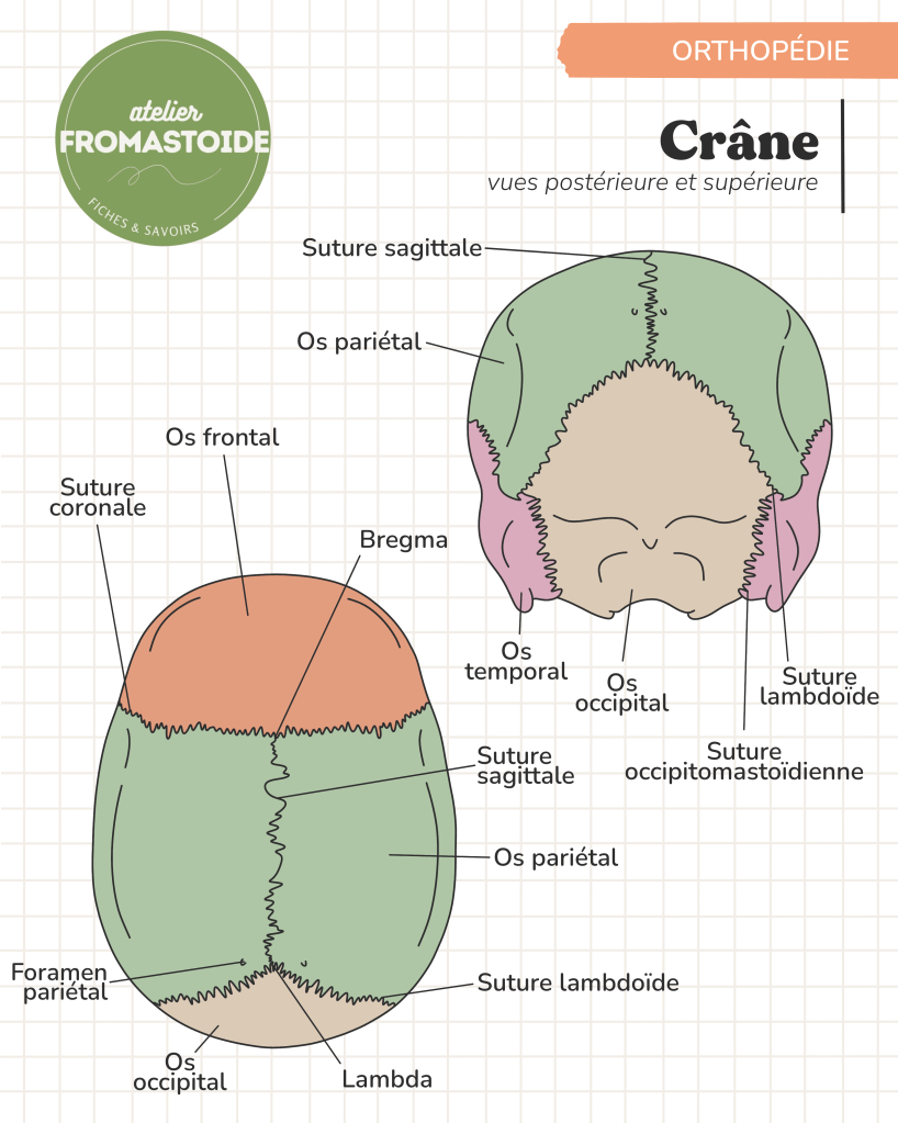 Les principales sutures sont la suture coronale (entre l’os frontal et les os pariétaux), la suture sagittale (entre les deux pariétaux), la suture lambdoïde (entre les pariétaux et l’occipital) et la suture squameuse (entre le pariétal et le temporal).