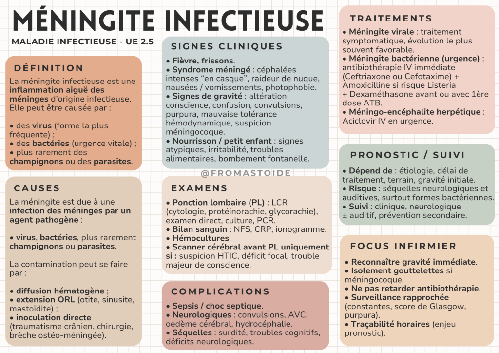 La méningite infectieuse est une inflammation aiguë des méninges (enveloppes du cerveau et de la moelle osseuse), d’origine infectieuse, principalement virale (souvent moins grave), bactérienne (urgence vitale), plus rarement fongique / parasitaire.