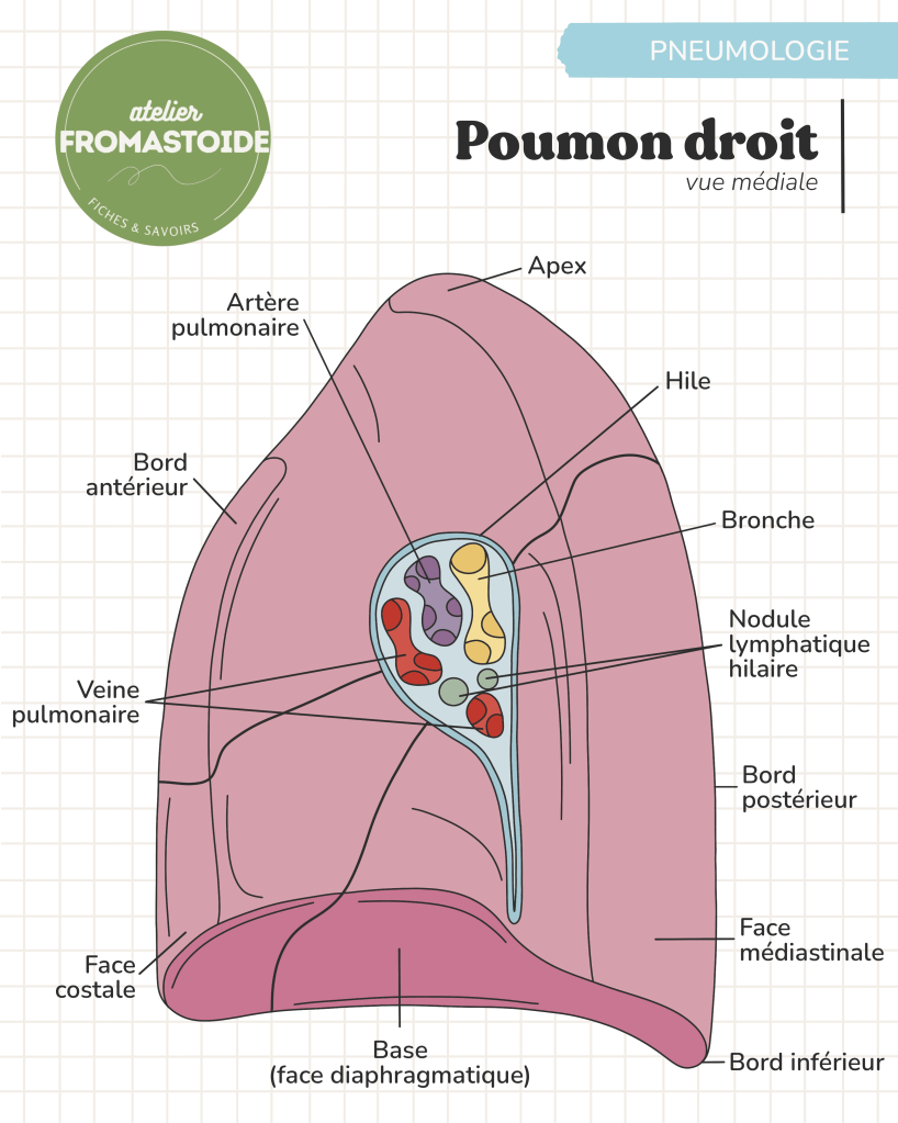 Sur sa face médiale, on retrouve le hile pulmonaire, zone de passage de la bronche principale droite, de l’artère pulmonaire droite, des veines pulmonaires, ainsi que des vaisseaux lymphatiques et nerfs.
