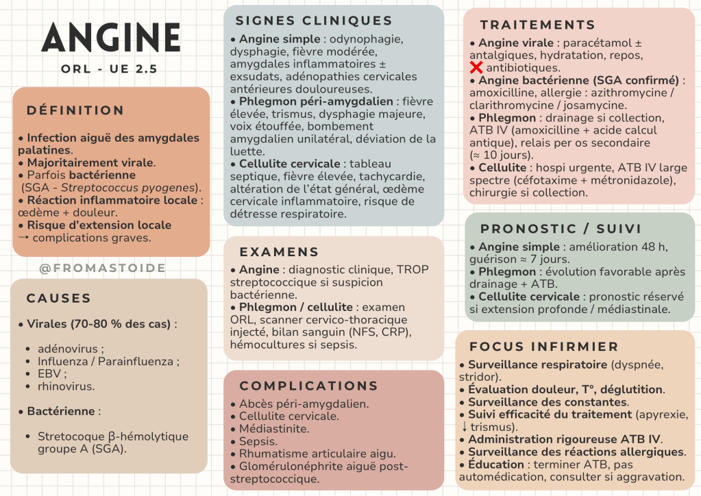L’angine est une infection aiguë des amygdales palatines, le plus souvent virale, parfois bactérienne, principalement due au streptocoque β-hémolytique du groupe A (SGA).
