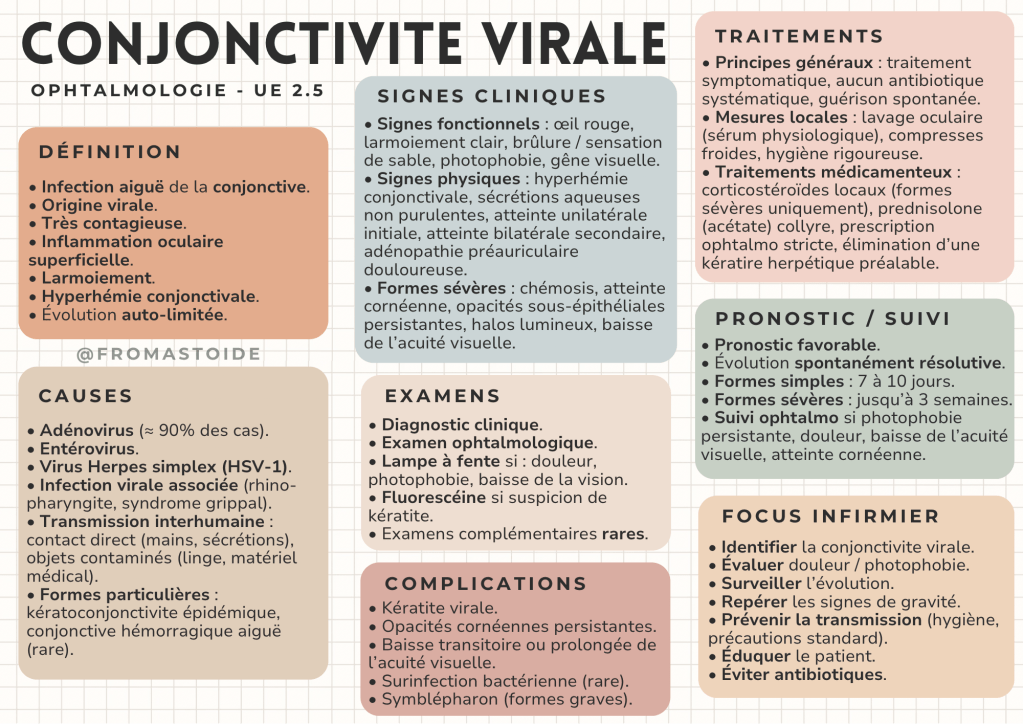 La conjonctivite virale est une infection aiguë de la conjonctive, hautement contagieuse, le plus souvent d’origine virale, caractérisée par une inflammation oculaire superficielle, un larmoiement et une hyperhémie conjonctivale.